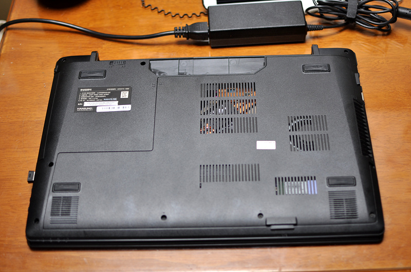 노트북은 한성 H56 모델인데 하판 분해가 아주 쉽습니다. 나사 4개만 풀면 끝!