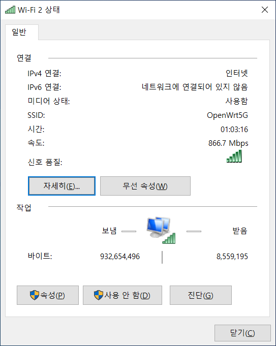 새로 구매한 AX200NGW 모델로 교체하니 433이던 무선랜 속도가 866으로 바뀐 것이 보입니다. 이 때만 해도 2배는 속도가 빨라질 것으로 꿈에 부풀어 있었죠.