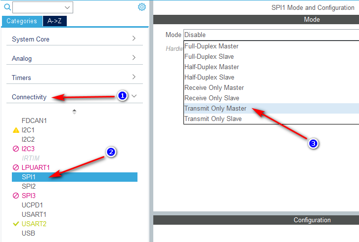 화면 왼쪽의 Connectivity를 누르면 아래로 메뉴가 나타나는 데요. 여기서 SPI1을 클릭합니다. 그리고 나서 오른쪽 Mode 설정에서 Transmit Only Master를 선택합니다.
