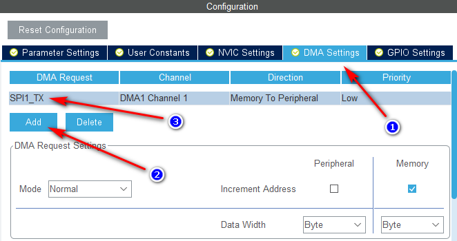추가로 SPI DMA 설정을 해 줍니다. 이 부분은 꼭 해줄 필요는 없지만 CPU가 효율적으로 일하는데 도움이 됩니다. 특히 OS를 이용하여 멀티 태스크 환경으로 동작시키는 경우에 더욱 유용합니다. 이 글에서는 별 의미가 없을 순 있겠지만 향후를 대비한 추가 설정 정도로 생각하시면 됩니다. DMA Setting 탭을 클릭하고 Add 버튼을 누른 다음 SPI1_TX를 선택해 주시면 끝.