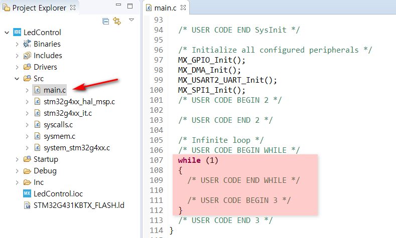 프로젝트 창의 Src 폴더에 main.c가 있는데요. 여기서 main() 함수를 찾은 후 맨 아래를 보시면 while 루프가 보입니다. 여기다 내가 필요한 코드를 넣으시면 됩니다. 혹시 STM32를 처음 사용하시는 분들이라면 Code Generater가 생성한 코드에서 USER CODE BEGIN과 USER CODE END 표시를 주의해서 보셔야 됩니다. BEGIN과 END 사이에만 사용자 코드를 넣어야 합니다. 그러면 추후에 하드웨어 변경이 있더라도 사용자 코드는 유지해 주는 것이죠.