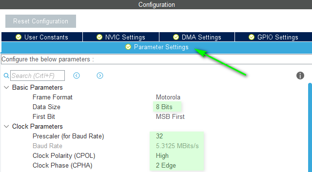 APA102C의 최대 SPI 속도는 정확히 모르겠습니다만 제 경험상 10MBits/s 까지는 잘 동작합니다. 그러니 그 값을 넘지 않도록 Prescaler를 지정해 줍니다. Prescaler가 크면 속도는 그에 반비례하여 줄어듭니다. 저는 32로 선택하였고 5.3125 MBits/s로 표시됨을 알 수 있죠. 나머지 설정들(Data Size, CPOL, CPHA)는 위와 동일하게 맞추면 됩니다. 상단의 Parameter Settings 옆에 빨간 x 표가 사라지고 초록 색 v 표로 바뀐 것도 볼 수 있습니다.