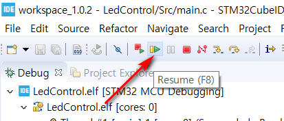 NUCLEO 보드에서 실행하기 위해 다운로드가 필요한데요. 벌레 모양의 Debug 버튼을 누르면 됩니다.