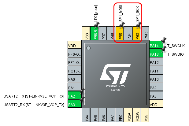 이 글에 앞서 1편에서 언급했듯이 구입한 LED 스트립은 APA102C라는 컨트롤러 IC가 내장되어 있습니다. 이 IC는 SPI라는 통신 인터페이스로 동작하기 때문에 MCU 쪽에서 이에 대한 지원을 추가해 줘야 됩니다. NUCLEO-G431KB의 경우 아두이노 나노의 핀 규격을 따르게 설계되어 있는데요. 그래서 거기에 맞게 PB5 핀을 SPI MISO 핀으로, PB3 핀을 SPI SCK 핀으로 설정하기로 하였습니다.