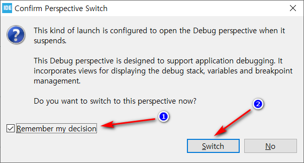 디버그 모드로 화면 전환할 거냐고 물어보는 건데 위 화면처럼 체크하고 Switch 하시면 됩니다.