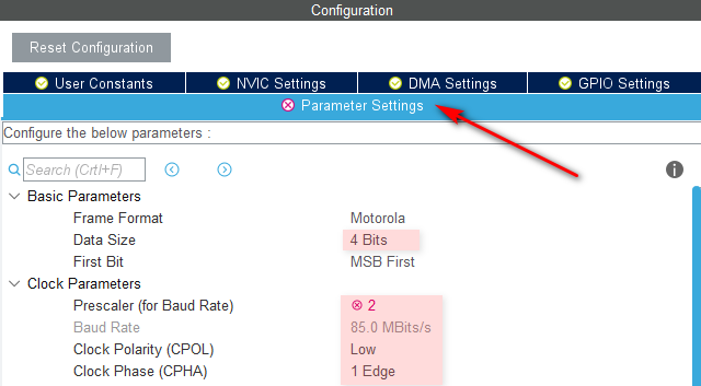 이제 세부 설정을 해줘야 됩니다. 일단 Mode 설정 아래 쪽으로 눈을 내리면 Parameter Settings에 빨간 x표가 보입니다. 그리고 그곳을 클릭하면 세부 설정이 보이는데요. 이때 빨간색 박스로 표시한 부분들을 APA102C에 맞게 변경해 줘야 됩니다. 일단 빨간 x가 표시된 이유는 Baud Rate가 너무 높아서입니다. CPU 코어의 클럭이 높은 제품이다 보니 기본 설정으로는 SPI의 속도가 너무 빠르게 설정된 것이죠.