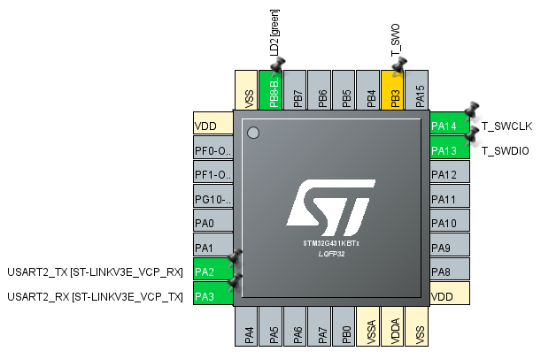 이제 개발을 위한 초기 설정이 끝났습니다. PC와 시리얼 통신을 위한 USART2와 디버깅을 위한 핀들 그리고 LED 하나(LD2) 설정된 것을 볼 수 있습니다.
