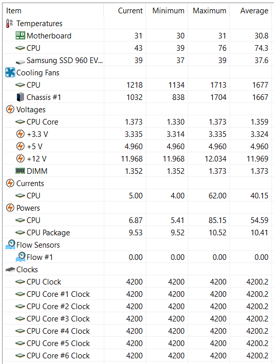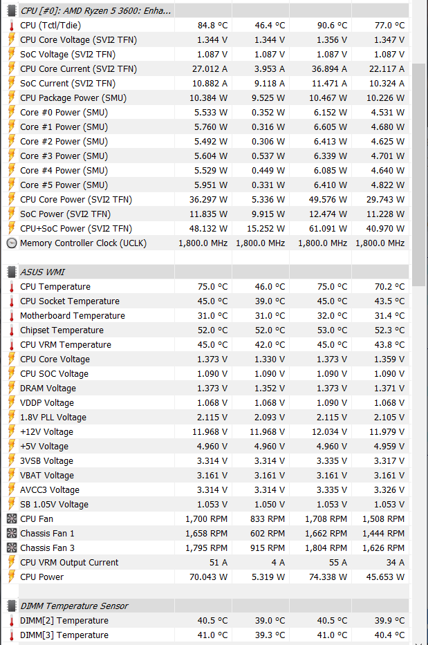 참고를 위해 HWiNFO로 상태 값들을 더 살펴봤습니다. AIDA64의 CPU 온도는 ASUS WMI 온도와 일치합니다. 램 모듈의 온도도 방열판 덕분인지 40도 밖에 안 되는군요. 더 높을 것으로 상상했었는데 의외였습니다. CPU 쿨러와 가까이 있다 보니 램 모듈 위로 공기 흐름이 좋아서 그럴지도?