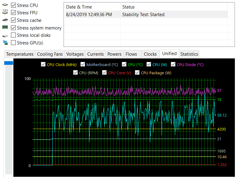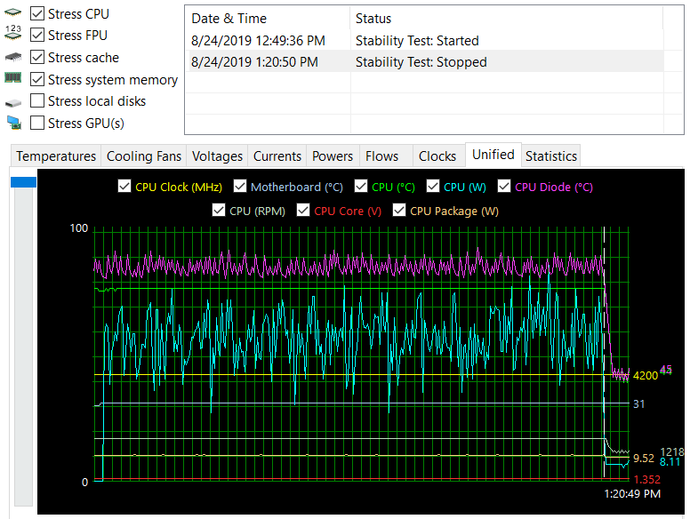 AIDA64 안정성 테스트를 기준으로 30분만 테스트하였습니다. CPU 온도는 76도 정도로 유지되었고 순간적으로 튀는 Diode 값이 좀 높긴 하지만 별 무리는 없을 것으로 생각됩니다.