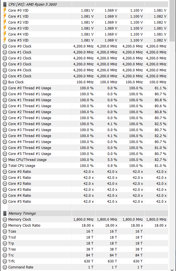 안정성 테스트 진행하면서 라이젠 마스터로 상태를 살펴봤습니다. EDC 값이 100%를 넘기는 것으로 나오는군요. AIDA64의 측정값과 차이가 나는데 누굴 믿어야 할지 모르겠습니다. 그리고 CPU 온도는 Diode 값으로 표기되는 것 같네요. 전압은 바이오스에서 고정했더니 1.1V로 표시됩니다.