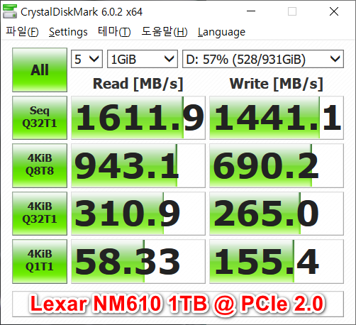 간단히 성능을 측정해 봤습니다. 참고로 메인보드에 여분의 M.2 슬롯이 없어서 PCIe 슬롯 어댑터를 사용했는데 장착한 슬롯이 2.0 버전인 관계로 읽기에서는 제 속도를 못 내는 측면이 있는 점 오해 없으시기를 바랍니다.