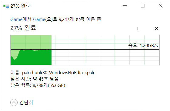 실 사용시 쓰기 속도를 살펴봤습니다. 가끔 1.3GB/s까지도 올라가긴 하는데 평균적인 속도는 대충 저렇습니다. SLC 캐시를 넘어서는 정도의 대용량 복사는 거의 하지 않는지라 일상적으로 이 속도라고 생각하면 될 듯하네요.