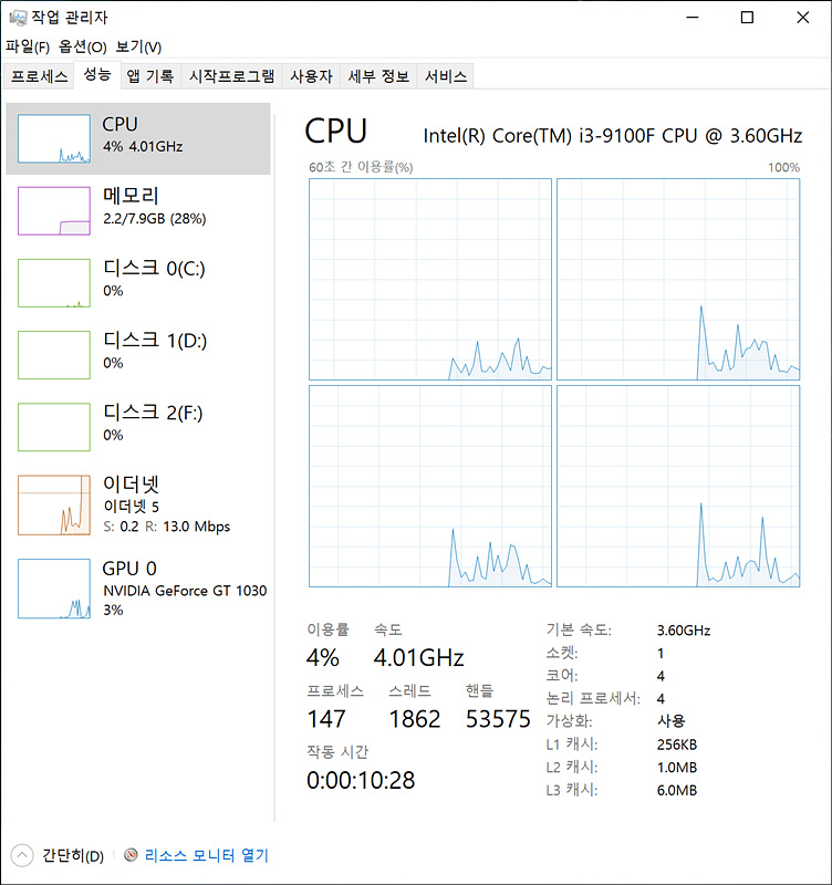 팬 소음 관련해서 첨언하자면 웹서핑 등 일반적인 용도에서 사용 시 소음이 조금 더 있는 느낌입니다. G5400에서는 로드가 어느 정도 걸려야 팬 소음이 느껴지는데 9100F는 팬 소음이 났다가 사라졌다 반복하네요. 어차피 로드가 심할 때는 개찐도찐이지만 영화 볼 때만큼은 소음이 올라오지 않았으면 하는데 어떨런지 모르겠습니다. 전원 모드를 바꿔본다던지 천천히 만져보고 소감을 추가하도록 하겠습니다.