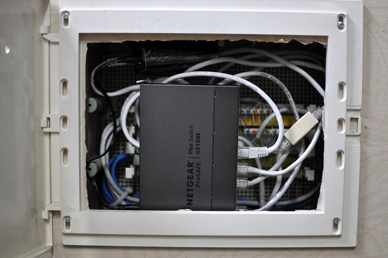 그나저나 깔끔한 배선을 기대하며 설치했던 스위칭 허브는 작업하고 났더니 인터넷이 이상한 상태가 돼서 거의 먹통이 되더군요. ㅠ.ㅠ 결국 인터넷은 공유기에 직접 넣어줄 수밖에 없었습니다.(오른쪽에 보이는 커플러가 인터넷 라인입니다.) 공유기 두 대를 이용하여 2단 설치했을 때는 잘 동작하길래 인터넷 회선도 그리 되지 않을까 했는데 뭔가 다르더군요. 제가 모르는 네트워킹의 심오한 세계가 있는 건지... 이건 좀 더 연구해 봐야겠습니다.