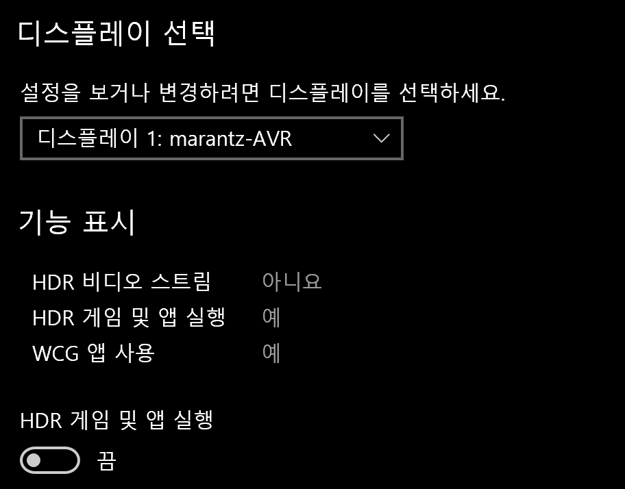 첫 번째로 PC에서 HDR 출력을 설정하고 TV로 바로 출력하면 화면의 글씨들이 약간 아른거리는 느낌이 있었는데 SR6014를 통해 전송하니 전체적으로 선명도가 살짝 떨어지는 느낌이지만 글씨도 아른거리지 않고 매끈한 화면을 보여줍니다. 영상 프로세서의 처리 때문인지 전체적으로 컨트라스트가 강해져서 이를 보완하기 위해 TV 쪽에서 "대비" 값을 올려주고 "밝기" 설정을 약간 낮춰줬습니다. 다만 HDR 화면으로 설정하면 GT1030의 성능 때문인지 문제들이 좀 생겨서 현재는 HDR을 꺼놓고 사용중입니다.