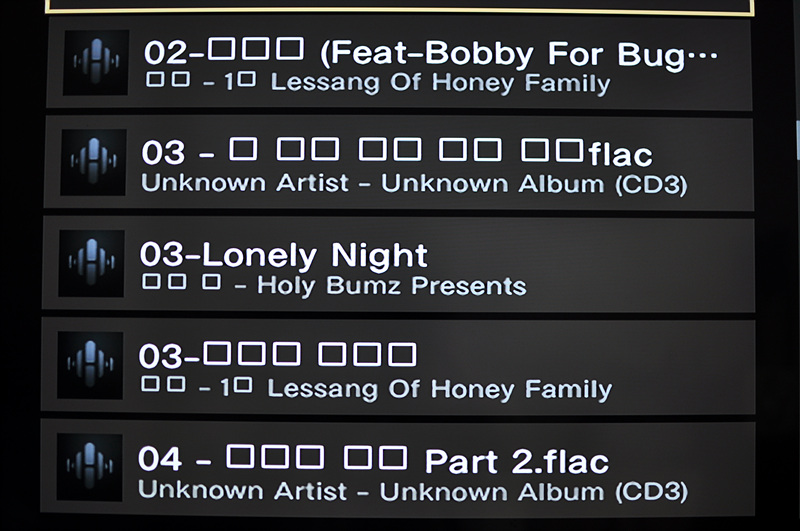 그리고 앱에서는 한글 파일명이 정상적으로 표시되지만 SR6014의 화면에는 모드 박스 문자로 표시됩니다. SR6014의 펌웨어에는 한글 글꼴이 없는 듯 한데 글로벌 시대에 너무 아쉬운 느낌이 듭니다. 한국에 정식 출시하는 기기인 만큼 이런 부분은 챙겨줬으면 좋겠네요. 하지만 음악 들으면서 TV 켜 놓을 거 같지는 않으니 별 문제는 안됩니다.