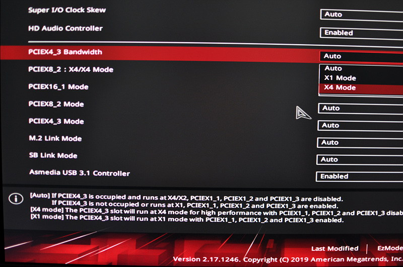 PCIe 링크 속도가 x1 ??? 분명 PCIe 2.0 x4 슬롯에 연결했는데 x1이라니!!! 하자가 있는 SSD를 받은 건가?? ㅠ.ㅠ;; 낙담하고만 있을 수는 없어서 BIOS 상에 강제로 x4로 고정하는 옵션이 없을까 하고 들어가 봤습니다.
