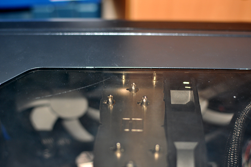 케이스(L700)에 사용 가능한 CPU 쿨러 높이가 최대 158mm인데 쿨러가 딱 158mm라서 혹시라도 조립할 때 걸려서 뚜껑이 안 닫힐까 걱정했는데 다행히 딱 들어 맞더군요. 아크릴 판 끝에 히트 파이프 끝 부분이 닿는 거 보이시죠? 뚜껑은 걸리는 느낌 없이 스무스하게 닫힙니다.