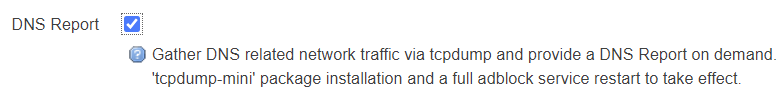 그다음에 화면 아래로 이동해서 DNS Report에 체크를 해 줍니다. 이 기능을 사용하지 않아도 광고 차단에는 문제가 없지만 차단 상태를 모니터링하고 Blacklist/Whitelist를 관리하기 위해서는 필요합니다. adblock 설치할 때 tcpdump-mini를 함께 설치한 이유이기도 합니다.
