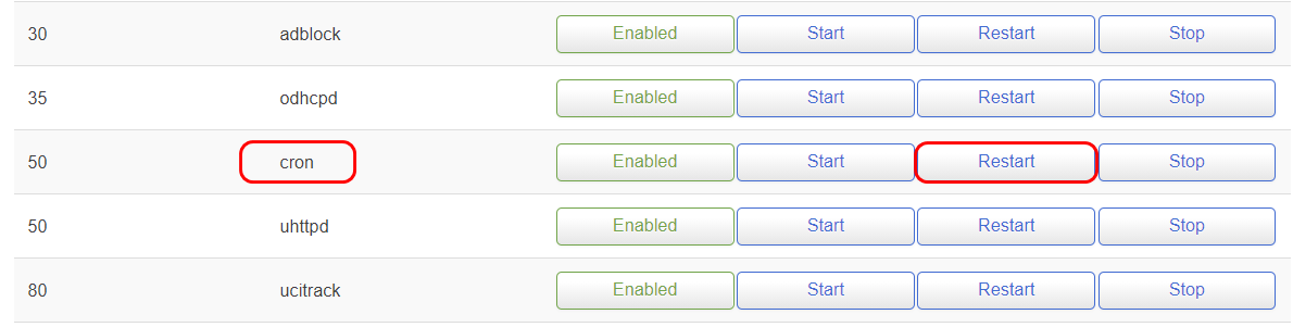 Refresh Timer 버튼을 누른 후 Restart를 선택하시고 적당한 시간을 적으시면 됩니다. 저는 새벽 4시로 설정했고 매일 업데이트를 하기 위해 마지막 칸에 *를 넣어주었습니다. 1주일에 한 번만 하고 싶다면 1-7(월요일-일요일 순) 중에 하나 넣으시면 됩니다. Save 버튼을 누른 후 System -> Startup 메뉴에 가서 cron을 찾은 다음 Restart 버튼 한 번 눌러 주세요.