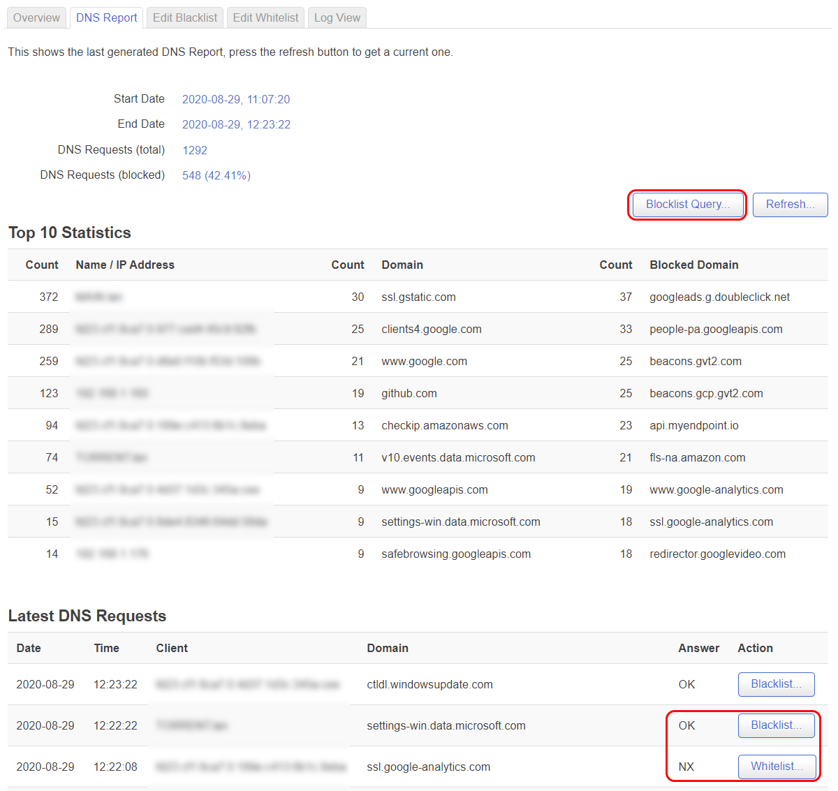 이때 하단부에 보이는 OK와 NX를 확인하시면 어떤 도메인들이 허용/차단되는지 알 수 있으며 필요하다면 Blacklist 또는 Whitelist에 바로 추가할 수 있습니다. 그리고 특정 도메인이 차단되는지 검색해 보고 싶다면 Refresh 버튼 왼쪽에 있는 Blocklist Query 버튼을 이용하시면 됩니다. 주소만 입력하면 어떤 Sources에 의해 차단이 되는지 볼 수 있습니다.