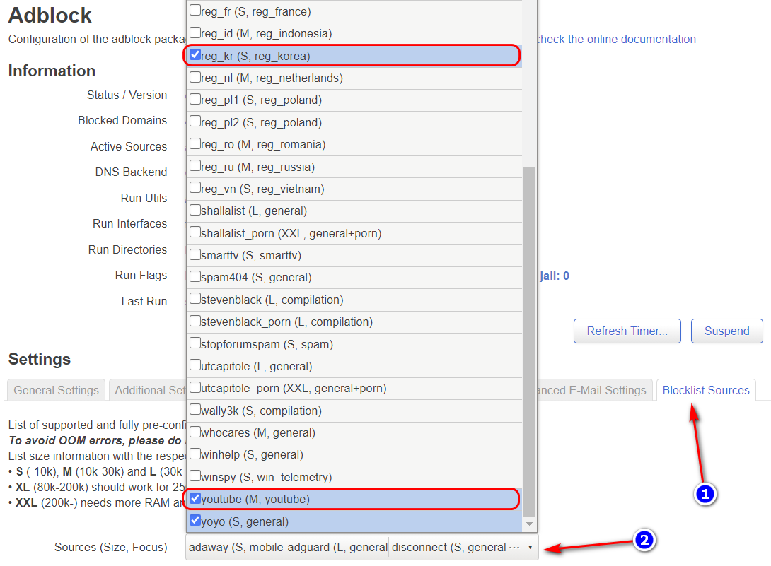 Settings 탭에서 Blocklist Sources를 선택하고 Sources를 클릭해 보면 많은 목록이 나오는데 저는 이 중에서 reg_kr과 youtube를 추가해 줬습니다. Save&Apply 버튼을 눌러주고 잠시 기다리면 아래와 같이 바뀌는 것을 볼 수 있습니다.