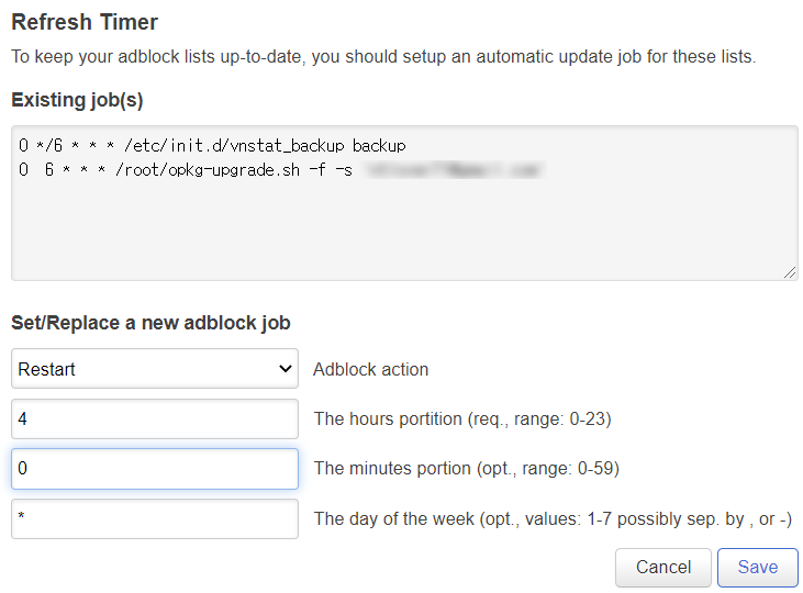 이제 기본적인 설정을 마쳤으니 필터를 주기적으로 갱신하기 위해서 스케줄을 추가하고자 합니다. cron 서비스에 등록하는 절차인데 메뉴에서 간편하게 설정할 수 있게 되어 있습니다.