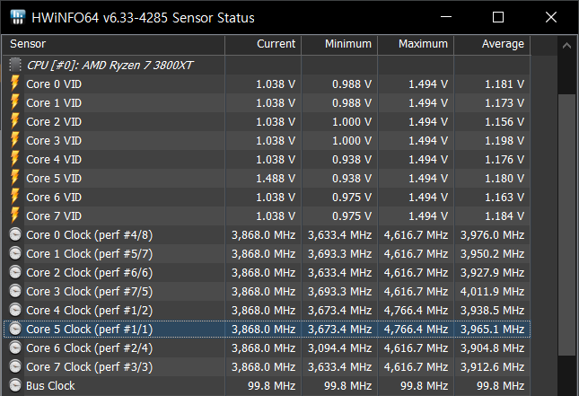 좀 더 지켜보니 싱글코어 부스트는 최대 4766MHz까지도 나옵니다. 3600(출시 초기버전)에서는 스펙상 4.2GHz인데도 4150MHz에서 더 이상 올라가질 않았었는데 3800XT는 스펙상의 4.7GHz는 순간적으로 넘기도 하네요.