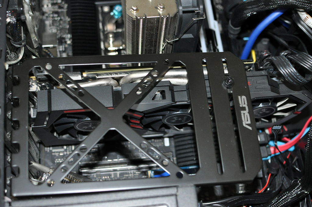 이 제품의 재밌는 점 중 하나는 그래픽 카드 지지대가 포함되어 있다는 겁니다. 멀티 그래픽 카드의 사용을 고려한 제품다운 특징입니다. 두 개의 그래픽 카드를 지지할 수 있고 쿨링을 위해 팬 설치도 가능합니다.