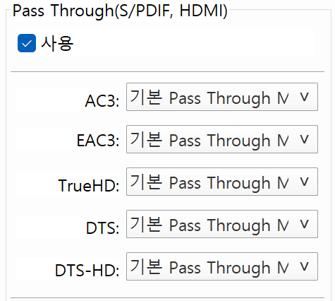 TrueHD 대신 DD+(Dolby Digital Plus) 소스를 재생해 보니 Pass Through가 정상적으로 동작합니다. 드라마들은 DD+ 소스가 대부분인지라 제가 그동안 TrueHD 문제를 모르고 지냈는지도 모르겠습니다.