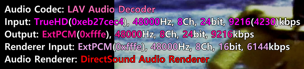 팟플레이어 재생정보 상으로는 정상적으로 TrueHD를 인식하고 출력이 나가는 것처럼 보이더군요. 하지만 Pass Through가 되질 않고 PCM으로 디코딩되어 출력되고 있었던 것죠.