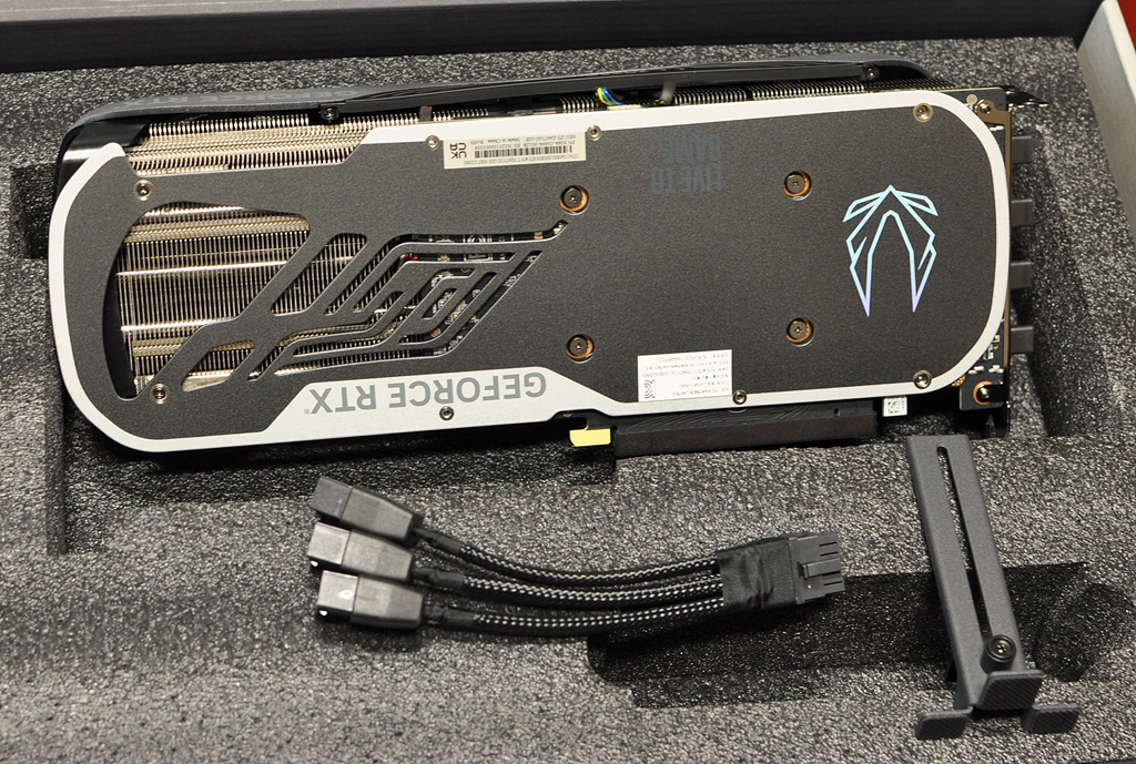 박스 내부에는 그래픽 카드와 전원 젠더, 지지대가 들어 있습니다. 4000 시리즈에서 선보인 조텍의 유선형 디자인은 은근한 멋스러움을 보여줍니다. 지지대 기본적으로 내장되어 있는 것도 좋습니다. 다만 지지대 높이가 좀 낮은 편이라 케이스 구조에 따라서는 사용이 불가할 수도 있겠습니다.