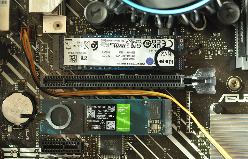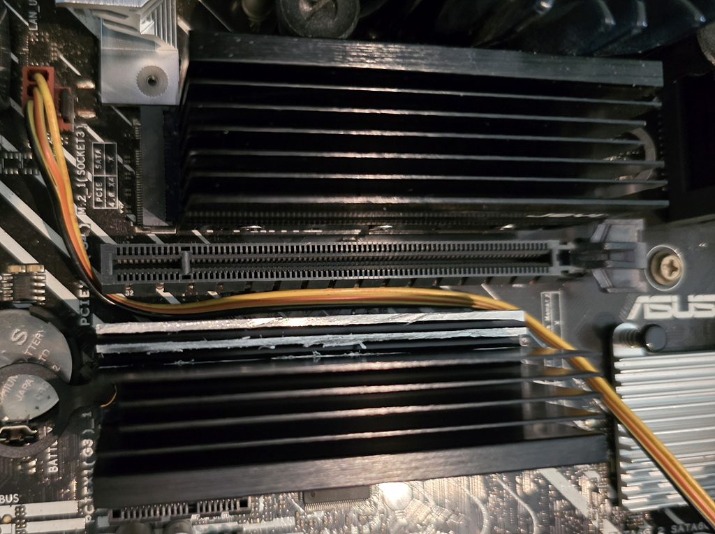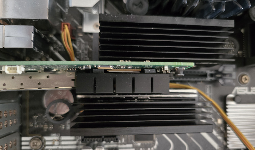 하단 SSD 위치가 PCIe 슬롯에 가까운데 SSD에 부착해 둔 방열판이 랜 카드의 방열판과 닿아서 설치가 불가능했습니다. ㅠㅠ (위 사진은 방열판 달기 전 상태) 방열판을 달지 않으면 SSD의 온도가 80~90도까지도 올라가기 때문에 고민 끝에 SSD 방열판 가공에 들어갑니다.