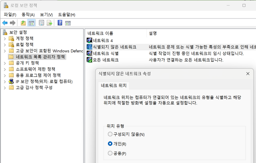 해결책은 로컬 보안 정책에서 찾았습니다. 식별되지 않은 네트워크의 위치 유형이 '구성되지 않음'으로 되어 있던 것을 '개인'으로 변경해 주고 장치 관리자에서 어댑터를 사용 안함으로 했다가 다시 사용으로 바꿔주니 그제야 네트워크 종류가 바뀌었습니다. 그러고 나니 Ping도 잘 되고 폴더 공유도 성공! 구 버전 윈도에서는 이렇게 해주지 않아도 잘 됐던 것으로 기억하는데 현재 제가 사용 중인 윈도 11 24H2에서는 보안 정책이 변경된 것인지 모르겠네요.
