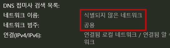 네트워크가 식별되지 않았다는 것과 네트워크 종류가 공용이라는 것. 공용 네트워크는 보안상 네트워크 기능이 제한되기 때문에 문제가 있겠다 싶더군요. 그래서 이걸 개인 네트워크로 바꾸려고 했으나 네트워크 목록에 나오질 않으니 설정 자체가 불가능.