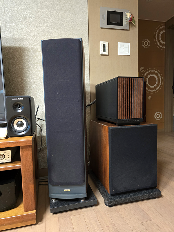 조립 후 서브우퍼 위에 올려 놨는데 블랙 우드 모델이라 거실 분위기와 자연스럽게 어울립니다. 나중에 알게 된 사실인데 전면부에 동작 LED가 하나도 없어서 전원이 켜진 건지 구분이 안 되는 점은 살짝 아쉽더군요. 다만 그 덕에 깔끔한 느낌을 주는 것도 사실이긴 합니다.