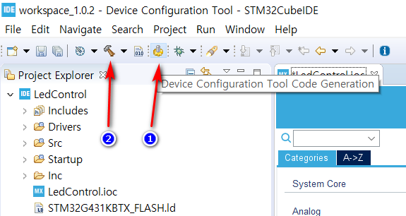 STM32CubeIDE 메뉴에서 Code Generation 버튼을 누른 후 잠시 기다려 줍니다. 오른쪽 폴더 목록이 잠깐 바뀌면서 변경되는 것을 볼 수 있는데요. 작업이 끝났으면 끝났다고 알려 주면 좋은데 그렇질 않다 보니 분위기상 알아서 해야 됩니다. ㅎㅎ 몇 번 하다 보면 감이 오긴 하지만 이 점은 향후에 개선되었으면 좋겠습니다.