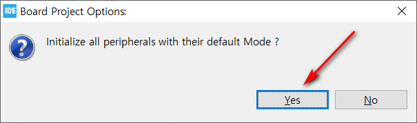 개발 보드에 구성된 회로에 따라 MCU의 핀들을 자동으로 설정해 줄까 하고 물어보는데요. Yes를 눌러줍니다.