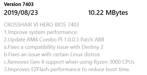 BIOS가 새 버전(7403)이 나왔길래 혹시나 하는 마음에 업데이트해 봤지만 차이는 없네요. 7401부터 하나 달라진 것이 눈에 띄는데 EZ-Flash 프로그램이 개선됐는지 바이오스 업그레이드 속도가 빨라졌습니다. 그리고 아쉽긴 하지만 PCI-e Gen 4 지원이 삭제됐네요. (혹시나 하는 기대를 꺾어 버리는 ㅠ.ㅠ)