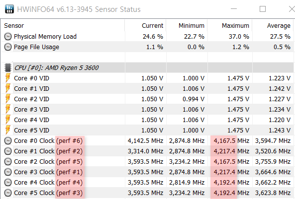 그래서 다운받아 실행해 보니 위와 같이 코어 우선순위가 표시되고 최대 부스트 클럭에서 #1, #2는 4217까지, #3, #4는 4192까지, 그리고 #5, #6는 4167까지 올라가는 걸 확인할 수 있었습니다. 새로 나온 윈도우 10 19H2에 추가됐다는 선호 코어 기능 때문인지 PBO 알고리즘 때문인지는 모르겠지만 품질이 더 좋은 코어를 적극적으로 사용한다는 측면에서는 바람직해 보입니다.