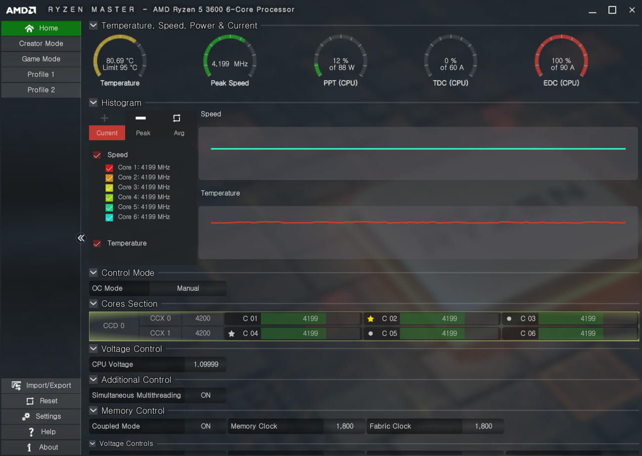 전압과 클럭 배수를 바꿔 가면서 테스트해 본 결과 4200에 1.35V로 결정하였습니다. 4150에 1.3V 설정도 나쁘지 않고 전압도 더 낮출 수 있을 것 같지만 PBO보다 확실히 올라가지 못하면 수동 오버가 의미가 없을 것 같아서 그렇게 하였습니다. 제가 오버클러킹을 할 때는 가급적 전력 효율에 중점을 두기는 합니다만 이 번에는 조금 예외적으로 결정했습니다. 전압을 올린다고 해서 소비전력이 급격하게 오르지 않은 것도 그런 결정에 한몫했고요.
