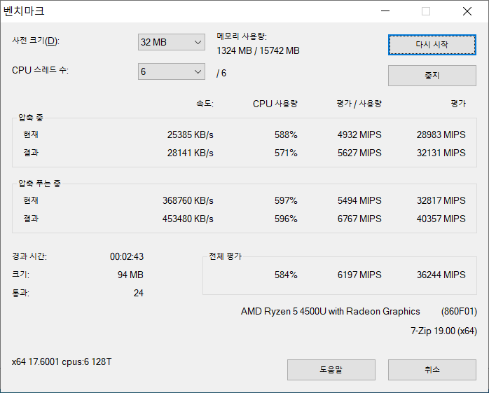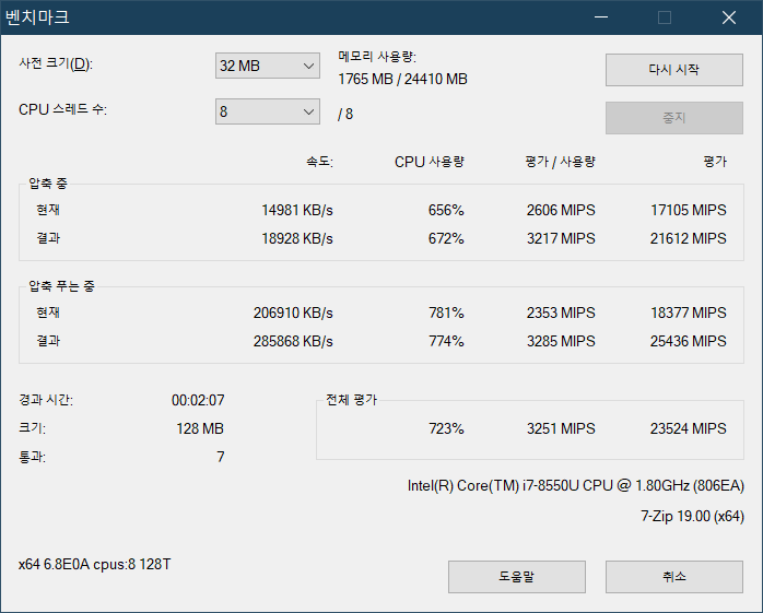 성능을 보기 위해 첫 번째로 7-Zip 벤치마크를 돌려봤습니다. 왼쪽이 4500U, 오른쪽이 8550U인데요 아래 나오는 나머지 화면들도 마찬가지입니다. 전체 평가 값만으로 보면 대략 8550U 대비 4500U가 1.5배 정도 빠릅니다.