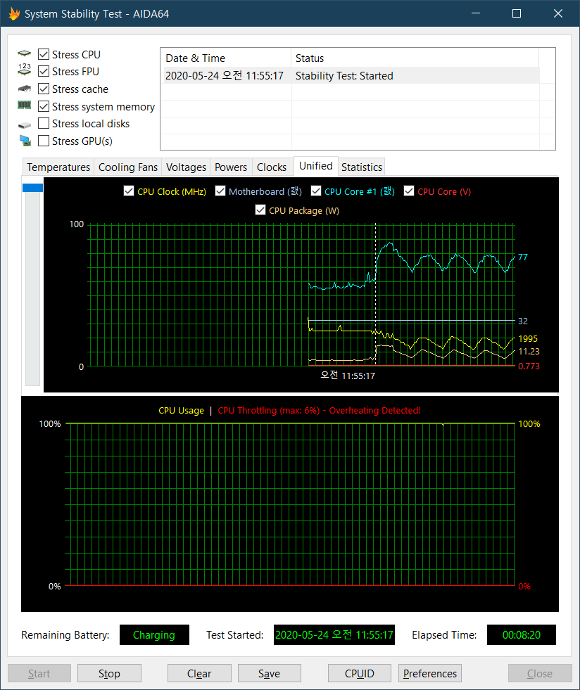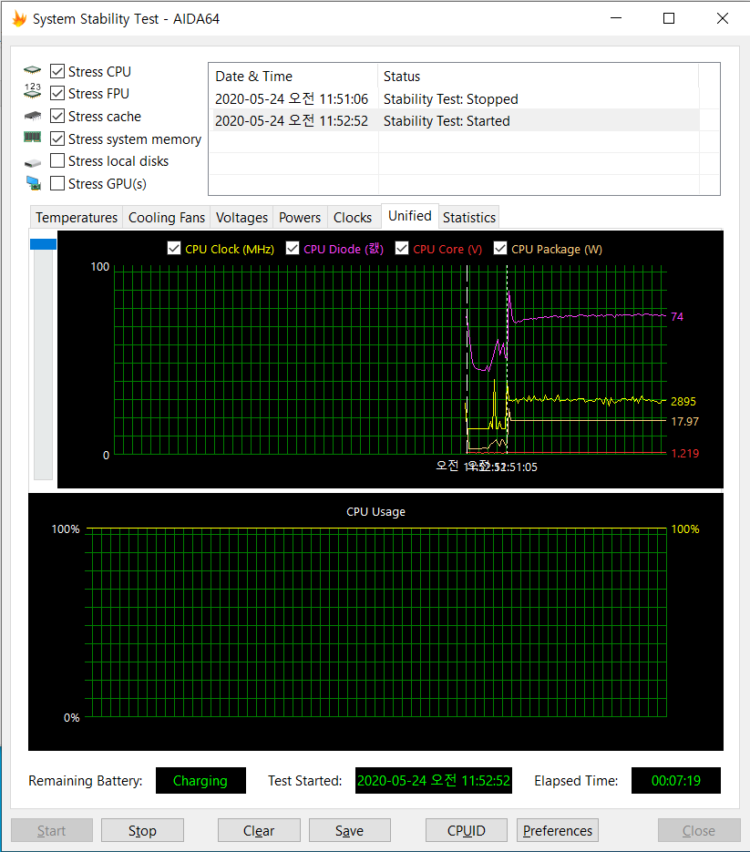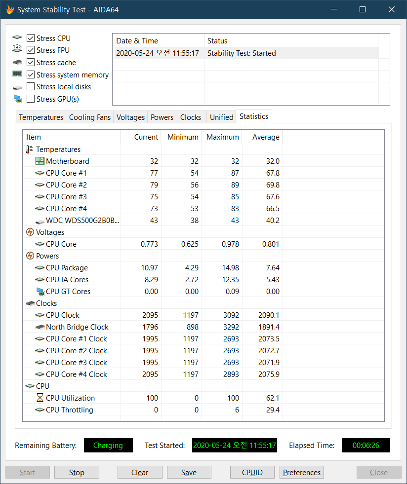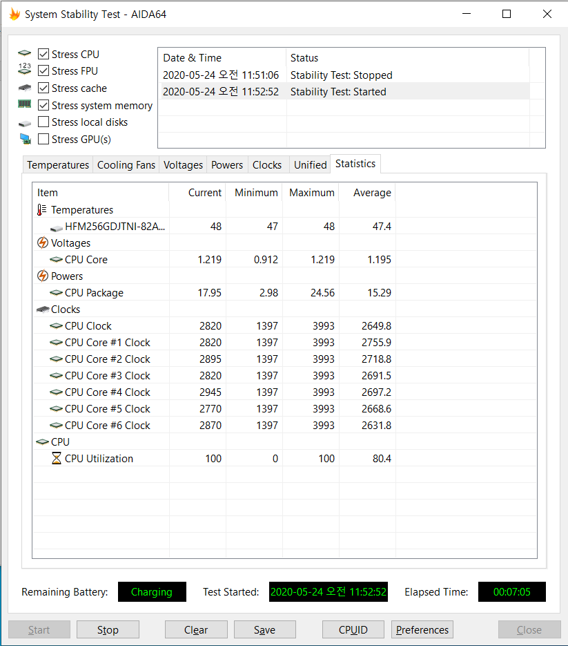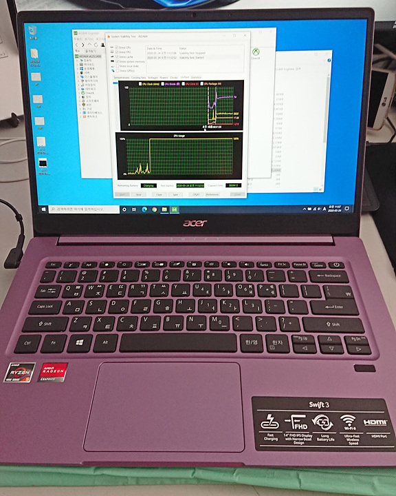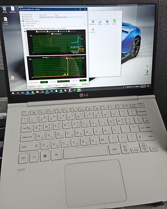 다음은 AIDA64 안정성 테스트입니다. 4500U는 풀로드시에 2.9 GHz를 유지하는 반면 8550U는 1.3~2.0 GHz 사이를 오르락내리락합니다. 뇌피셜입니다만 LG 그램의 가벼운 무게와 팬 소음이 극히 적은 것을 생각해 보면 온도 제어 특성 때문에 그런 것 아닌가 싶습니다. 이 때문에 실성 능에서 큰 차이를 나타냅니다.