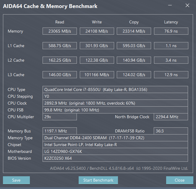 다음은 메모리 벤치마크입니다. 램은 당연히 3200 MHz DDR4일 것으로 생각했다가 4266이란 숫자를 보고 프로그램 오류인가 싶었는데 4500U 스펙을 다시 보니 4266 MHz까지 지원하더군요. Latency가 좀 아쉬운 것을 빼면 Read/Write 성능은 2400 MHz DDR4 대비 거의 두 배에 가깝습니다. 그리고 L1 캐시는 앞서는 반면 L2나 L3 캐시는 밀리는 것을 볼 수 있습니다.