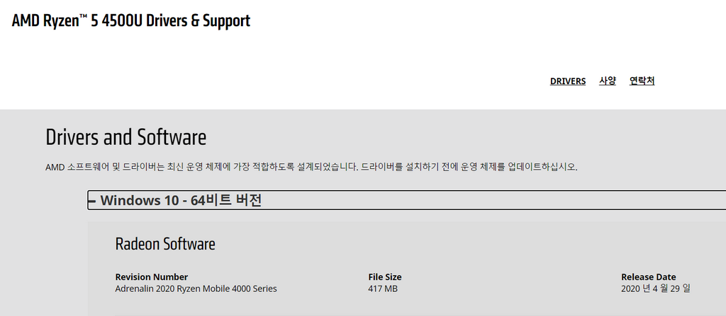 라이젠 모바일 4000 시리즈를 공식 지원한다는 Windows 10 2004 버전을 설치하니 장치 관리자에 드라이버가 모두 잡히긴 했습니다만 혹시나 싶어 AMD 홈페이지에 들어가 보니 르누아르 드라이버가 있더군요. 받아서 설치해 줬습니다. 설정 프로그램에 다양한 기능들이 있던데 자세히 살펴보진 못했습니다.