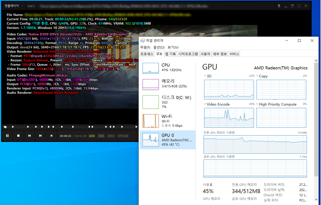 동영상 재생 성능도 살펴봤습니다. 4K UHD Bluray 영상을 재생하는 화면인데 하필 화면 캡처 한 시점에 영상을 스킵하면서 순간적으로 CPU 사용률이 올라갔습니다만 실제로 영상 재생하는 동안에는 10% 정도를 유지합니다. 비디오 엔진 로드는 영상마다 좀 달라서 숫자를 꼬집어 말하기 어렵습니다만 50% 이내에서 대부분 동작했습니다. 4K UHD Bluray 영상보다 부하가 심한 영상은 흔치 않으므로 대부분의 영상에서는 문제가 없다고 볼 수 있겠습니다.