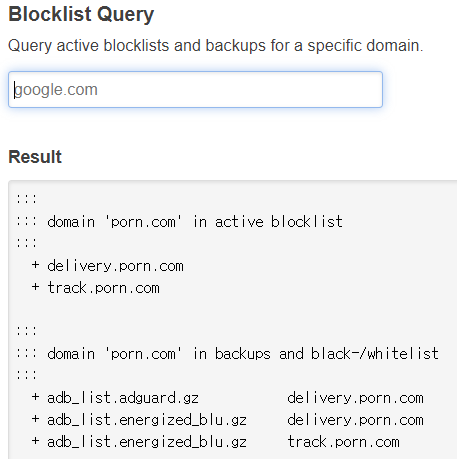 이때 하단부에 보이는 OK와 NX를 확인하시면 어떤 도메인들이 허용/차단되는지 알 수 있으며 필요하다면 Blacklist 또는 Whitelist에 바로 추가할 수 있습니다. 그리고 특정 도메인이 차단되는지 검색해 보고 싶다면 Refresh 버튼 왼쪽에 있는 Blocklist Query 버튼을 이용하시면 됩니다. 주소만 입력하면 어떤 Sources에 의해 차단이 되는지 볼 수 있습니다.