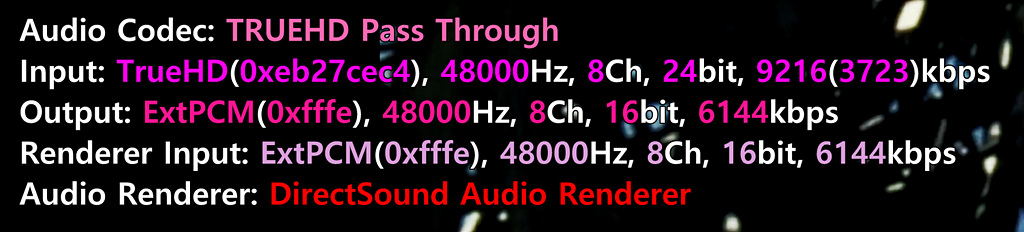 팟플레이어 재생정보 상으로는 정상적으로 TrueHD를 인식하고 출력이 나가는 것처럼 보이더군요. 하지만 Pass Through가 되질 않고 PCM으로 디코딩되어 출력되고 있었던 것죠.