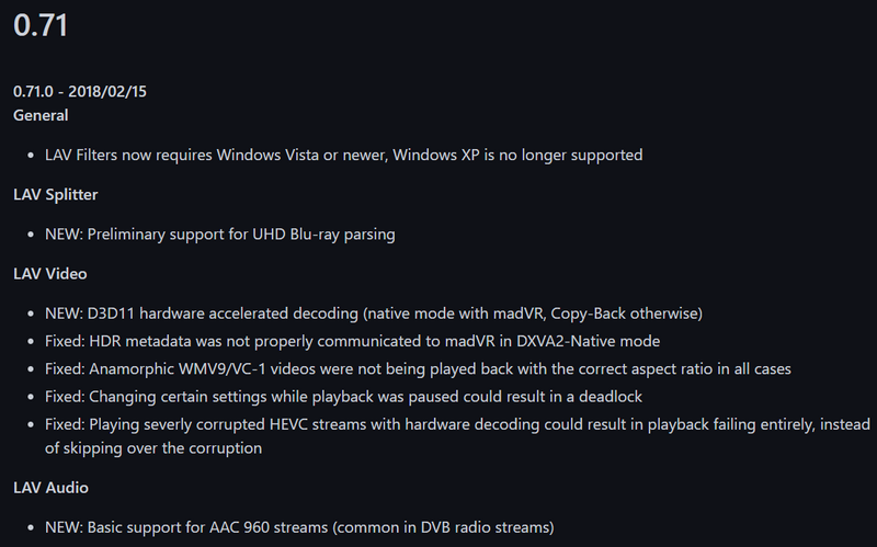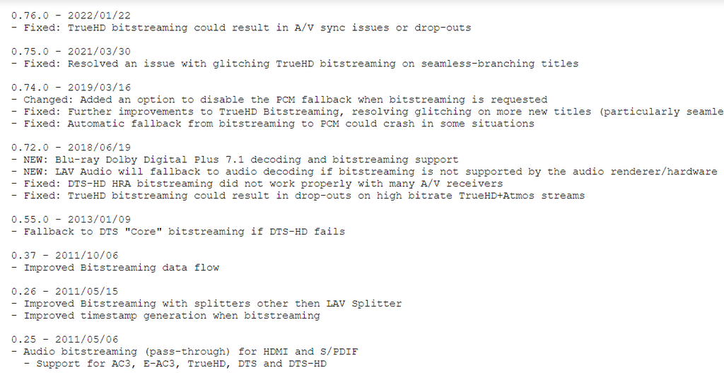 LAV 변경 이력중 bitstreaming에 해당되는 것만 검색해 보니 0.72에서 Pass Through(bitstreaming) 관련하여 수정이 많이 된 듯한데 이때부터 뭔가 문제가 생긴 게 아닌가 싶습니다. 다만 LAV 코덱 자체의 문제라기보다는 제 PC 환경에서만 발생하는 호환성 문제일 수도 있으니 오해 없으시기를 바라며 혹시 저와 유사한 증상을 겪고 있는 분들이 계시면 구 버전을 시험해 보시기 바랍니다.
