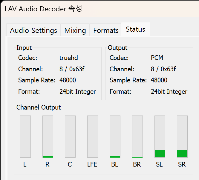 다시 LAV Audio Decoder로 변경한 후 Status를 확인해 보니 bitstreaming으로 표시되지 않고 PCM으로 출력됩니다.